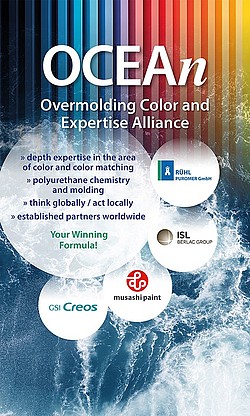 OCEAn – Think globally, act locally, that is our mission to further establish the PU overmolding technology – also known as ColorForm, clearmelt, Direct Coating oder In-Mould Coating Technology, in the world market. This requires the presence of experts and best practice closely following the market. We serve this need by the recently founded Overmolding Color and Expertise Alliance – called OCEAn for short.